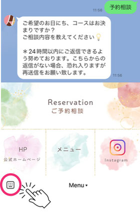 左下の赤丸(キーボードマーク)をタッチ。文章を入力できます。ご予約相談内容を入力して送ってください。